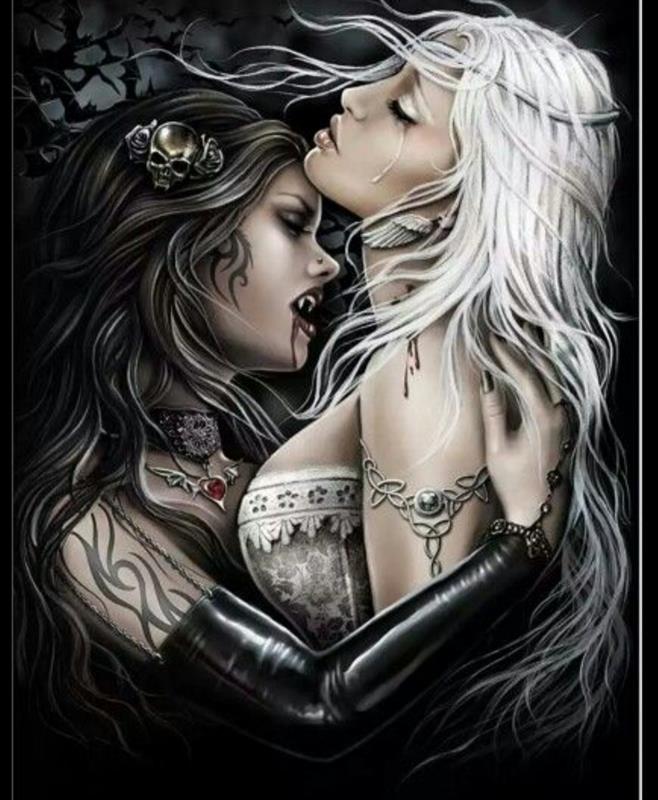 “Whatever,” she grins, “just let me touch those gorgeous tits, for heaven’s sake.” She fondles my breasts, her movements hurried and impatient. I close my eyes and feel her warm breath on my neck as she’s licking me. “You’re right, it’s much more exciting if it doesn’t happen just yet. I like suspense… I will savour your blood later. Nothing can stop me tasting you in other ways,” she murmurs suggestively, kneeling between my legs. She pushes them further apart and explores my folds, manoeuvring her tongue like a virtuoso.