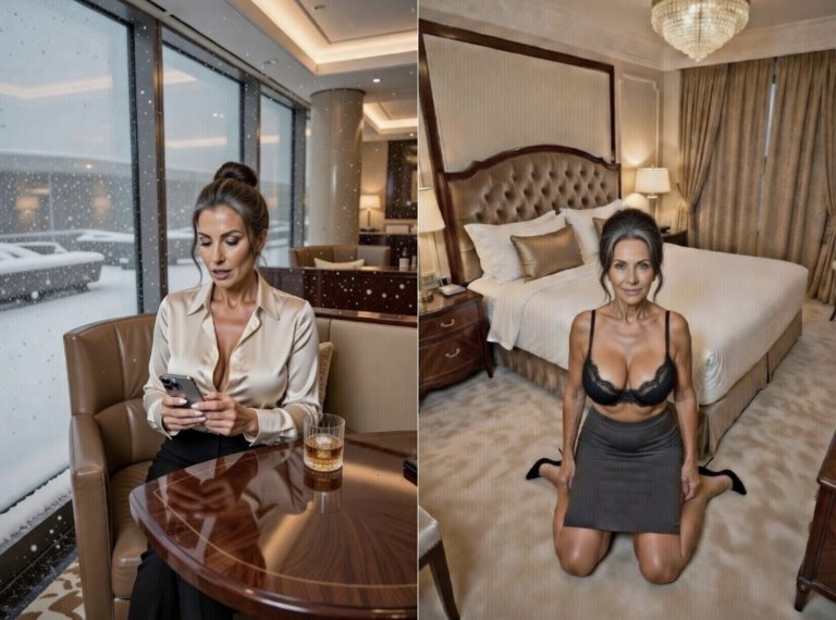 She sat alone at a corner table in the dim lounge light, scrolling through her phone with the calm authority of someone accustomed to being in charge. Approaching fifty, expensively dressed: a tailored charcoal wool coat draped over the chair, cream silk blouse and dark grey pencil skirt that clung softly to an hourglass figure, large, full breasts straining gently against the fabric, narrow waist flaring into wide, generous hips and a curvy, rounded bum that shifted hypnotically when she crossed her legs. Dark hair swept into a messy bun, with a few loose strands escaping to brush her cheeks. She looked up, met my gaze, and gave a small, measured smile.