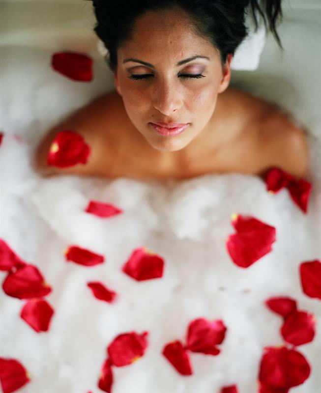 She walks over and steps into the bath. She sinks into the wonderfully hot water which was filled with bubbles and a handful of rose petals.
