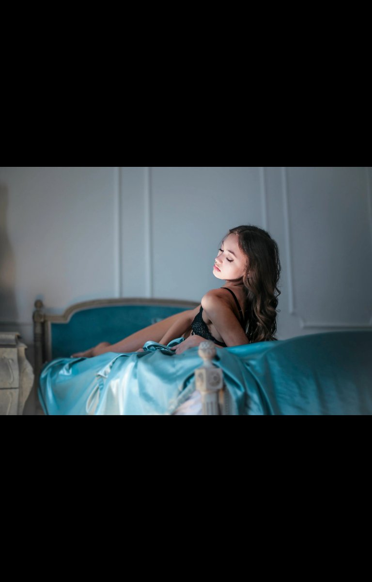 For a few seconds, she feels like she’s floating, almost blacking out from her extremely intense orgasm. Her body goes limp on the white sheets, eyes closed and with a satisfied, serene smile on her face.