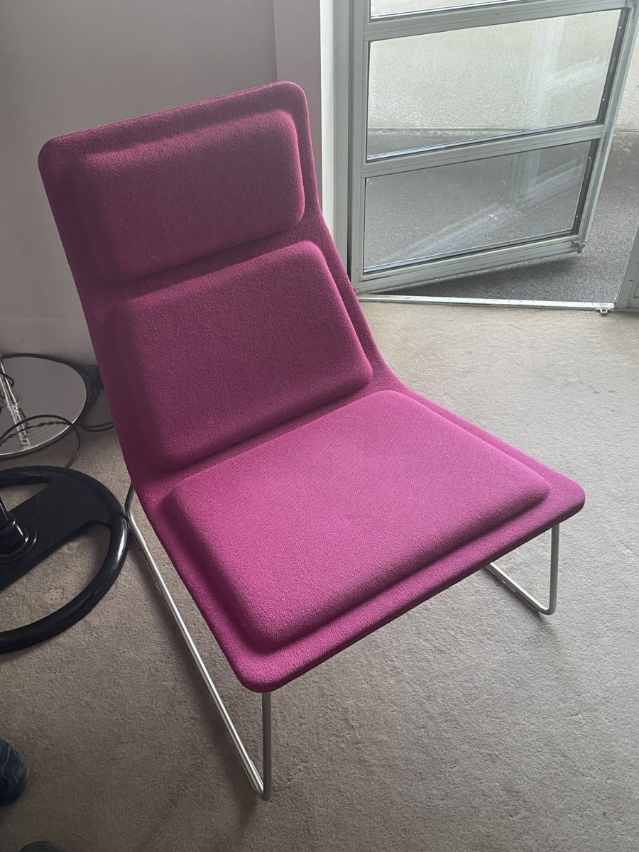 Her red leather chair has no armrests and is the perfect design for Yab-yum.