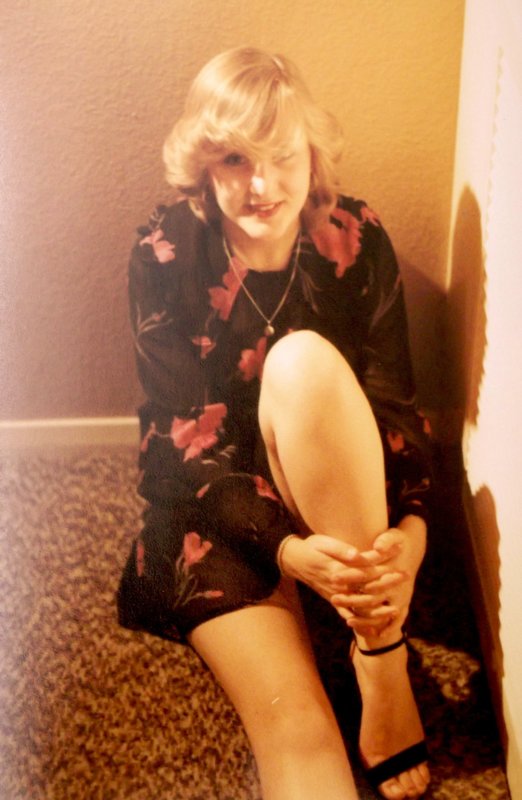 Back at her brother’s house, June had showered, re-applied her make-up, and re-styled her hair. By the time I had showered, she had dressed once again in her beautiful little chiffon dress with the same black suede high heels.