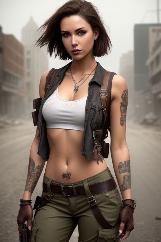 With trembling fingers, she peeled off the sticky fabric of her tank top, the air cool against her bare skin. She had become accustomed to the layers she wore in the wasteland—the armor that protected her from the harsh sun and the prying eyes of those who would do her harm. But now, in the privacy of her tent, she allowed herself to feel the softness of the fabric of her bra, a luxury she had not allowed herself in a very long time. Her pants, too, felt restrictive, the heavy material weighing her down. She unbuckled the belt, letting the cargo pockets hang loose, and slid the fabric down her legs, leaving her in just her underwear.