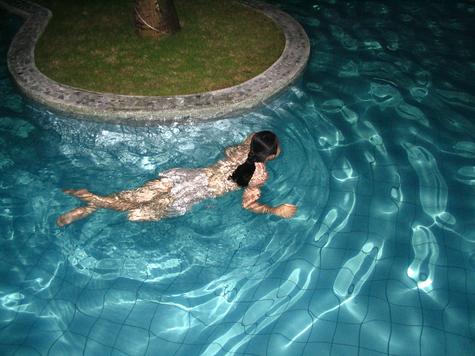 You get off me and I slip, wetly and shrivelled out of that hot, wet place as you stand up. We embrace, your tears from the passion of the moment wetting my shoulder. Then you hold my hand as we walk round the corner by the back of the house and towards the pool. You stopp to flick a switch and the pool-edge lights come on on their lowest setting as we walk down the steps into the shallow end.