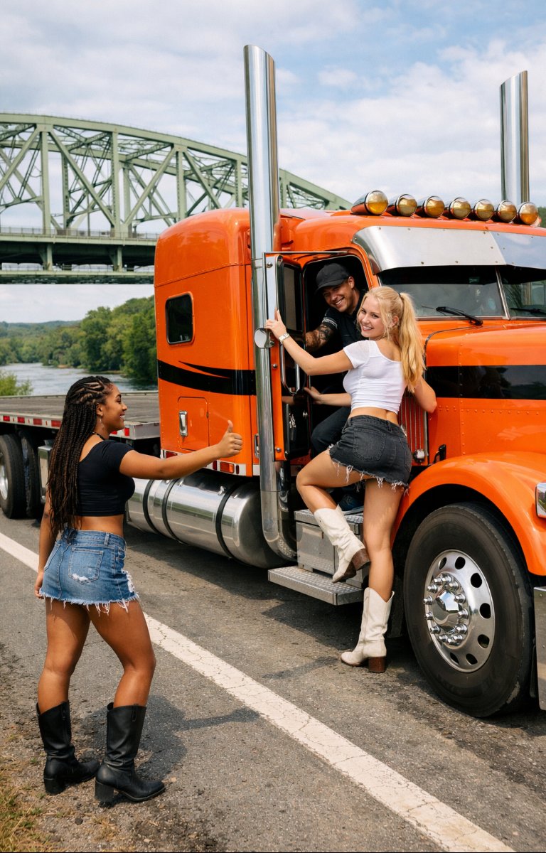 “You look… younger than most truckers,” I blurted out, voice trembling. My friend shot me a knowing look, a grin pulling at the corners of her mouth. I glared back, embarrassed.