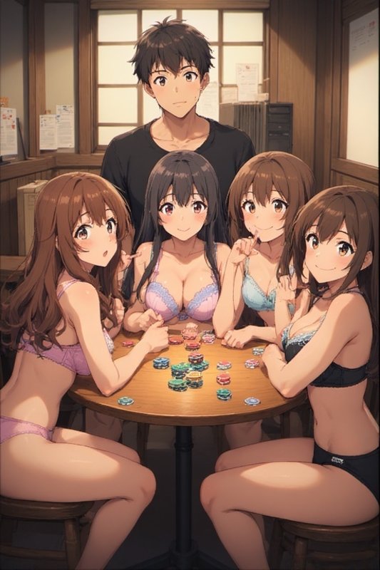 “I’ll deal.” Emma says with a smile on her face, already shuffling the deck she’d pulled from a drawer. The rules set: standard five-card draw, person with the worst hand each round strips one item, no folding to save clothes—pure luck and bluffing. Since they can’t use Wi-Fi to look up the official rules, and none of them care about sticking to them anyhow, they just play with simple rules.
