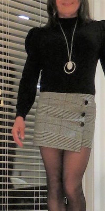 Once home I showered, gave myself an enema, and got dressed for my morning appointments. It was much cooler than yesterday so I chose a long sleeve black sweater with puffy shoulders, a black and white short herringbone skirt, black thigh high stockings and my red high heel pumps. My lingerie choice was matching black thong gaffe and bra. My first stop was the DMV to get my Massachusetts Driver’s License. I was surprised how easy it was, the agent did not question anything when I showed my Connecticut license and my proof of residency in Massachusetts. My photo was taken as Cassie and I was issued a temporary license and my new one should arrive within two weeks.
