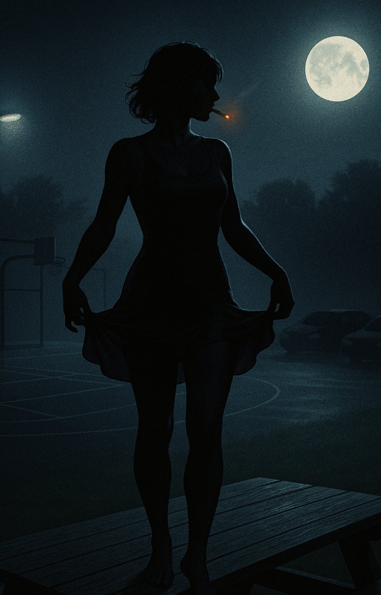 She simply stepped forward, spread her legs just slightly, and tilted her hips toward him — the soaked dress clinging to her curves, translucent now under the park lights. She stood there like a statue of sin, thighs glistening, waiting.