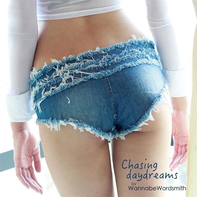 My reverie always follows the same pattern, passion spilling over, tugging stretchy top beneath braless chest, then slavishly kissing and biting the firming nipples as she stifles gasps. Sinking to my knees and tearing open the buttons of her barely-there shorts, I shower her tiny panties in kisses and insistent licks.