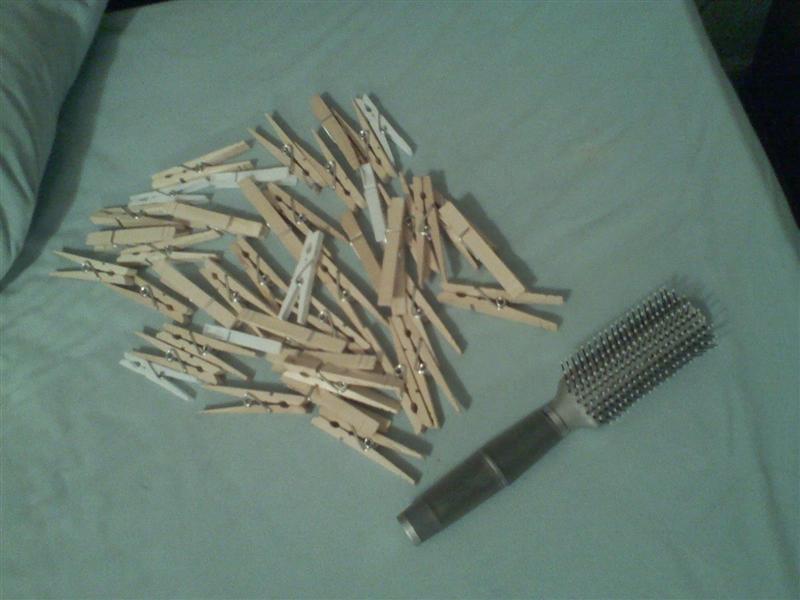 He must sense my trouble and takes pity on my soul. He has me slide a hair brush handle in my pussy. It goes in deep, four rows of bristles hitting my clit as I pulse it in hard and fast. Pulling on the pins on my left nipple and slamming the brush in deep, my body finally releases the hard fought orgasm. Waves of pleasure crash through my body, flowing from pinned pulled nipples to my pulsing clit and back again.