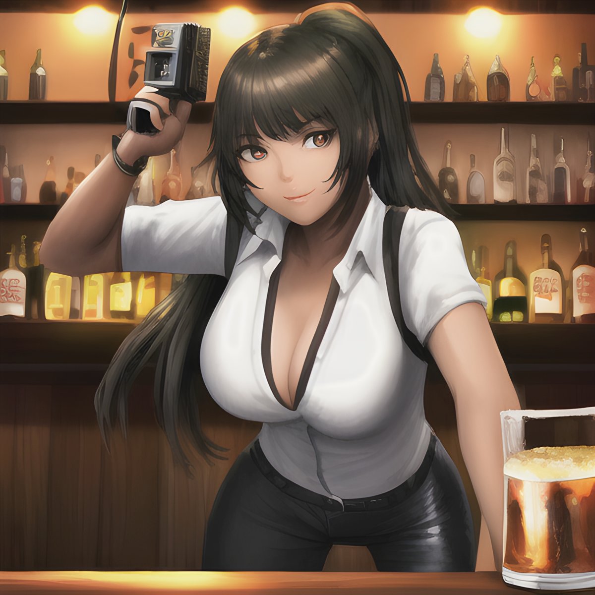 Clara slowly stands up, her legs shaking. The whole bar cheers and welcomes her loudly. Someone hands her a pitcher of beer and she drinks it in three big gulps. “Wow, what a mess we made…” she says, looking at the puddles of cum on the two tables and the floor below. “Wait, Barbie,” she says to today’s waitress, “I’ll help you clean up now.”