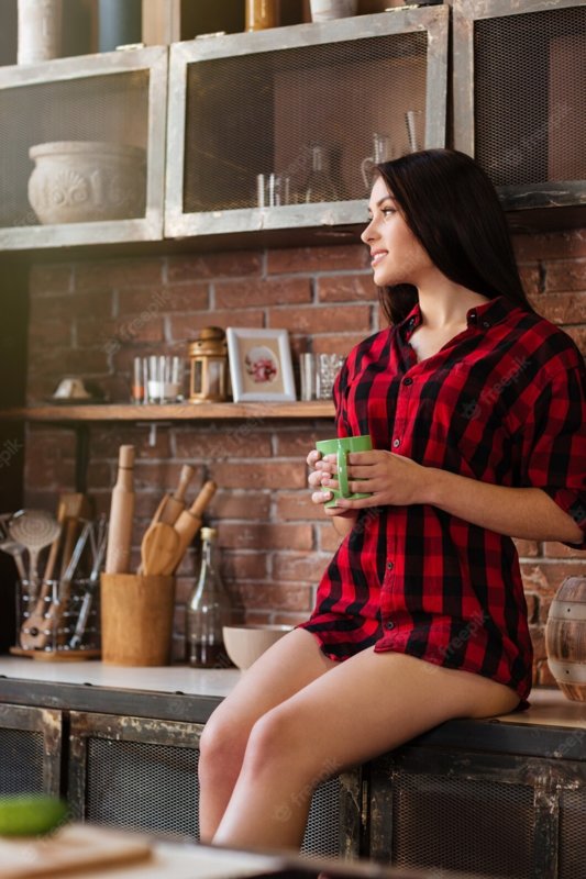 There was Gina, wearing nothing but a large flannel shirt, getting the coffee mugs out of the cabinet. As she reached up, I saw her shirt rise just enough to reveal a red and black thong.