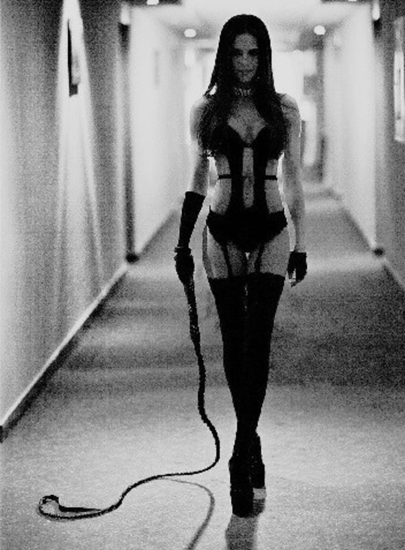 As I hung, suspended from the ceiling by my wrist cuffs, I heard the click of high heels coming towards me. I managed to twist my nearly-naked body around and beheld Domme Zoe walking towards me, a vicious-looking bullwhip in her hand.