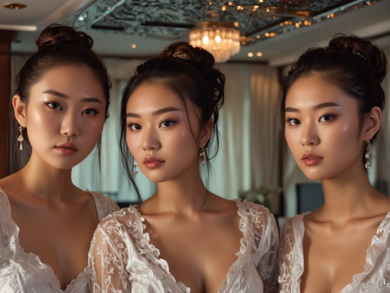 Diwei’s yacht was indeed a floating palace. The sexual tension had been building, and now in the privacy of the yacht, it was nearly unbearable. Diwei didn’t even bother with the pretense of a quick tour, instead leading them straight to a large, luxurious bedroom. The air was so thick with desire that nobody could speak for a moment. The three of them moved closer to Jim, almost touching. Ying was the first to press her body against his, her breath hot on his neck. Then Chanxin leaned in from the other side, her lips brushing against his ear.