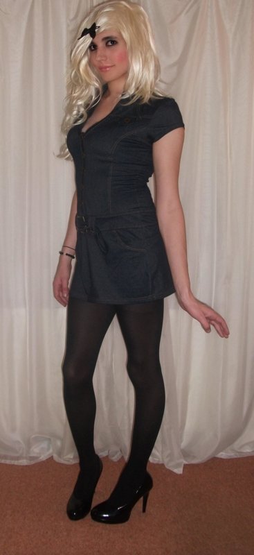 After getting my skin soft and smooth, I walked into the bedroom to see what Morgan had laid out for me this time. She liked to keep the outfits a secret from me. She ordered a bunch of stuff for our shows online but wouldn’t tell me what she had purchased; she wanted me to be surprised. On the bed lay a dark blue soft denim dress with quarter sleeves and a waist belt. Next to it was a set of peach-colored cheeky panties with a pink bow on the front and a matching push-up bra. There were also a pair of sheer black pantyhose, 4″ patent pumps, and a few bracelets and accessories.