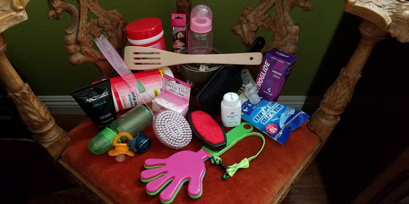 I went to the dollar store and let my mind go wild. I picked up a variety of items that could potentially enhance some of the experiences they might have in mind. With my kinky mind, I came up with quite a variety of items. Things like spanking implements, clips, oils, powder, rubber gloves, sanitation liquid, baby bottles, and pacifiers etc…