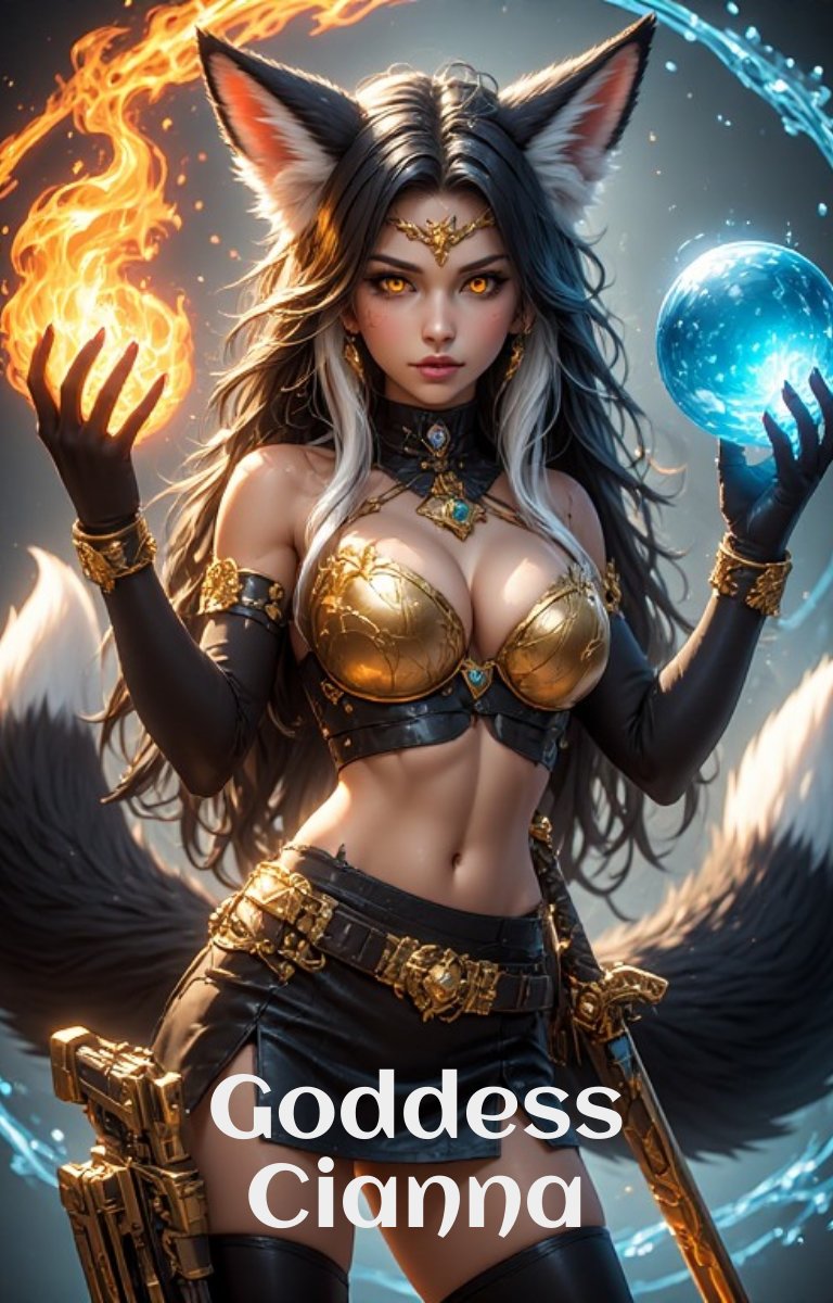 Out of the dust where the king had fallen, a figure of extreme beauty rose. Fire in one hand, swirling water in the other. Part human, part animal, she was crowned in gold. Golden armor covered her chest and back. Twin tails wagged with anger. The fox-like ears on her head lay back against her black hair.