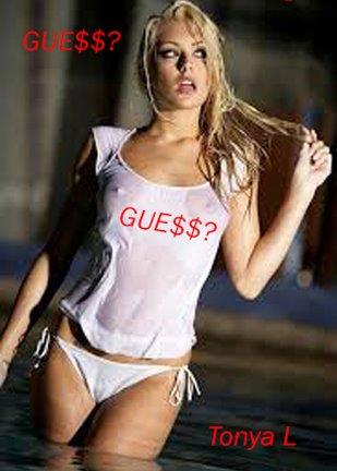 I picked up the scrap of fabric and held it up. How could Meadow expect this thing to cover me up? I looked at the other girls as they walked around in their thongs, they did not seem to have an issue with their breasts hanging out. They pulled the white t-shirts over their body. The question mark with a ‘Gue$$ ?’ logo stretched across their breasts. I looked down at my size DD’s and hoped no-one would guess their size.