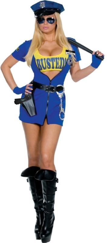 Its Halloween eve, my wife Sue is 5’6″ tall with long black hair reaching down to her shoulders. She is dressed as a very sexy policewoman, wearing knee high black boots. The short sleeve blue dress zips up the front and comes to the very tops of her thighs. She chose not to wear panties. Her yellow tube top has the word “Busted” written across it. Sue has handcuffs, toy gun and baton. She has on fingerless blue gloves and sunglasses. Her long blonde hair reaches down a little past her shoulders. Those aquamarine blue eyes of hers are very alluring.