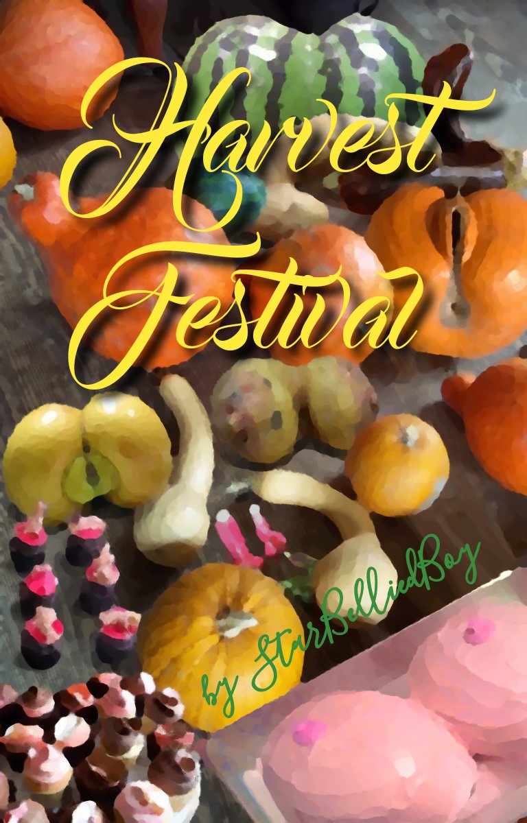 Eva scooped squished pumpkin flesh and cum from her cleavage, slurping it from her palm as she surveyed the village hall. Naked bodies lay tangled in satiated sleep amongst a chaos of demolished cakes, broken jack-o’-lanterns, and abused prize-winning vegetables.