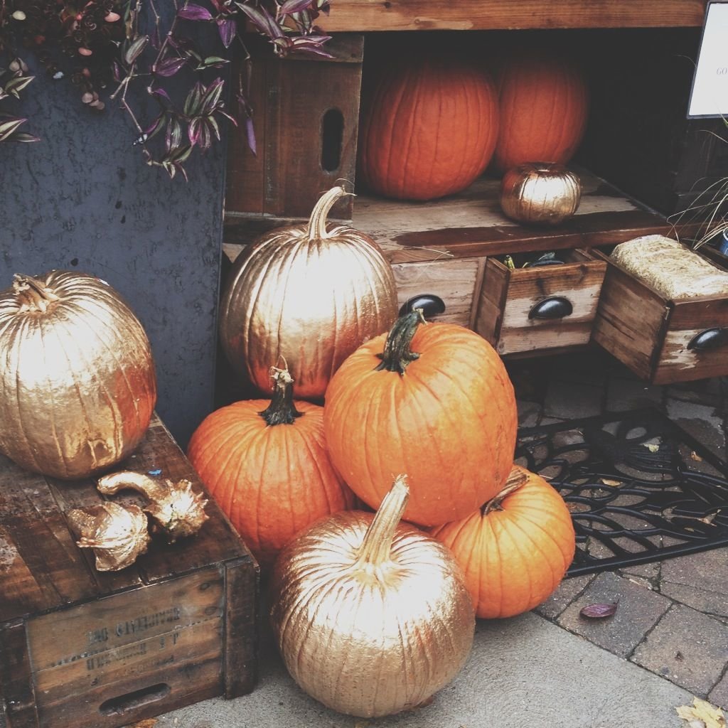 What I do like is autumn. It heralds the coming of the Holidays, so I put out pumpkins to celebrate. Orange, white, blue, and gold ones are sprinkled on my tables and in the wreath on the door. They scent my candles and flavor my coffee.
