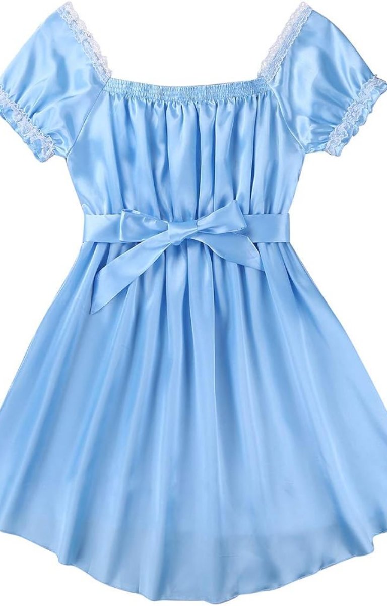 Lynn then instructed all three on the wardrobe for the evening. Maurice was handed a long white terrycloth robe. Paula was handed a similar one that was cut higher to show her ass cheeks, and was mostly open in the front to show her deep cleavage, barely covering her nipples. David was handed a baby blue nightie with ruffles on the sleeves and on the bottom. It also came down to just the top of his ass. In the front, it stopped just below his belly, nicely showing his pink cage.