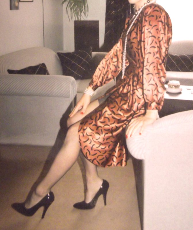 She then slipped on the bronze satin wrap-over dress, fastening the buttons on the sleeves and then finally doing up the two that held the front of the dress in place. It was my favourite dress of hers and was incredibly sexy. The wrap over lower front section of the dress revealed a huge amount of leg and stocking tops and often a glimpse of a suspender strap too. As she stood sideways onto me, the wrap-over front section also revealed a glimpse of Angela’s smooth hairless pussy, something I felt sure would please David.