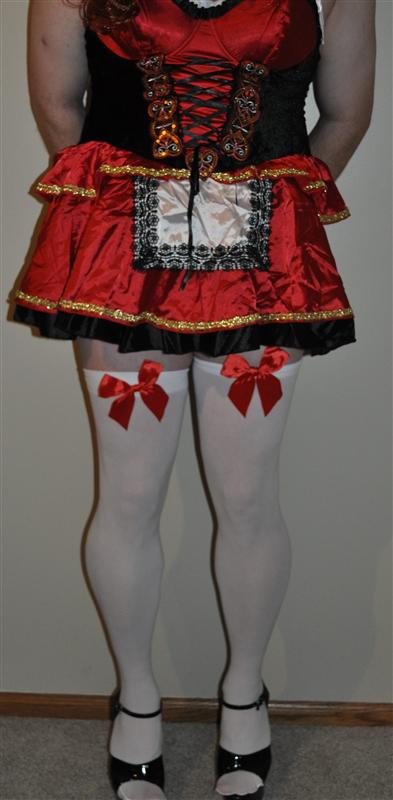 Soon I had removed all of my hair from my legs, crotch, rear, underarms, and chest. I felt really relaxed, and was ready to continue on to be Jessie. I painted my toe nails a bright read, put on a pair of red bikini panties, and my Red Riding Hood costume. Next I placed my wig cap over my head and then put on my red haired wig. I had to admit, even though at this point I wasn’t passable, I felt feminine. Finally I put on my white thigh high nylons with a little red bow at the top, and my black five inch platform high heels. I looked in the mirror and thought I was really looking hot.