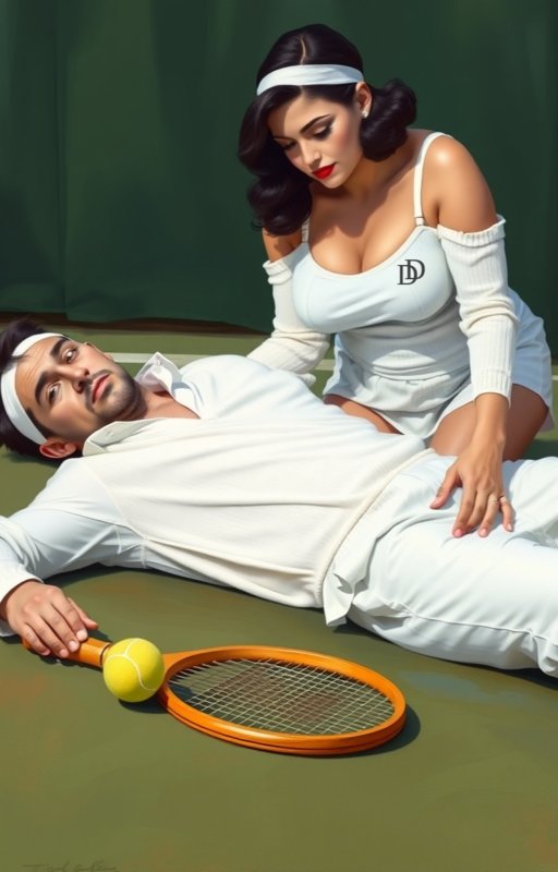 Delilah nodded and turned around to pick up a ball. Her short skirt crept up to reveal the back of her thighs, with Raoul’s eyes following its progress every inch of the way and his cock twitching appreciatively in his white pants. She straightened, turned to face him, and held the ball in front of her. Raoul bent his knees slightly, assuming a crouched stance, and nodded. Delilah tossed the ball aloft and swung her racket in a sweeping arc, smashing the ball directly into the net.