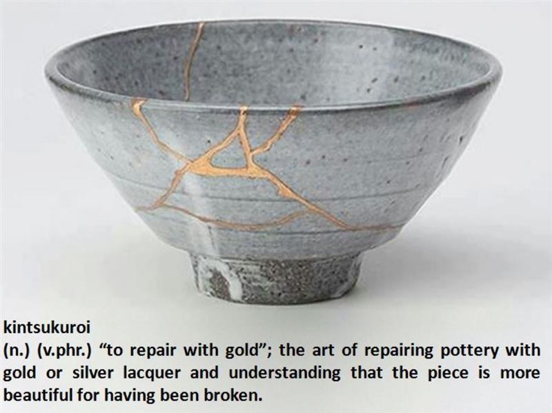 Kintsukuroi (n.) (v.phr.) “to repair with gold”; the art of repairing pottery with gold or silver lacquer and understanding that the piece is more beautiful for having been broken