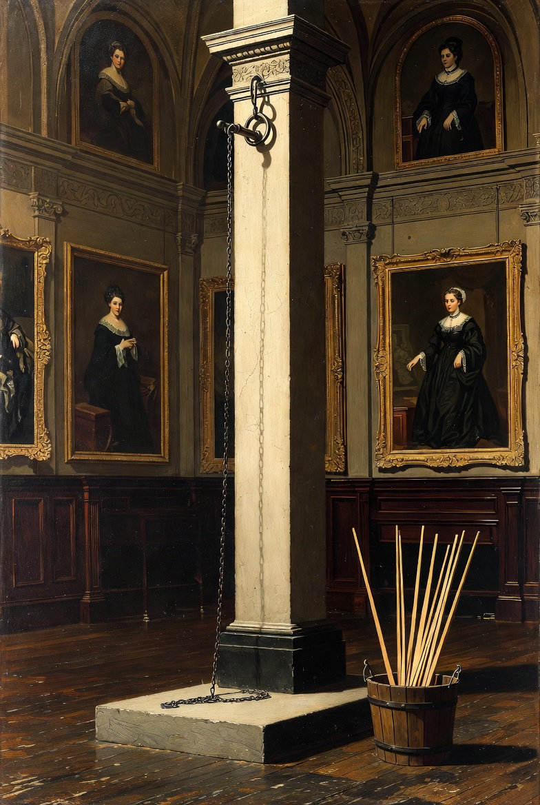 Under Alice’s curious and watchful glare from the upper gallery, Martha began the grim task. Once Gaby was stripped completely bare, Martha bound her wrists in heavy iron chains, hoisting them high until Gaby was forced to stand on her tiptoes against the cold stone pillar. The chilly air of the hall bit into Gaby’s punished skin, but it was the judgmental glares of the younger maids and the leering whispers of the footmen that cut deeper.