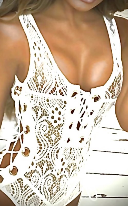 She met his eyes with a smile and enjoyed the short moment when his eyes drifted down along her body before she again sank to her knees and wrapped her fingers around his semi-hard shaft. She licked a large dew drop from the tip before engulfing the head with her lips while mildly humming as if savoring a delicacy. Then she pulled back a little and guided the end of it down into the generous cleavage created by the lace swimsuit. It snaked all the way down to the bottom of her breasts.