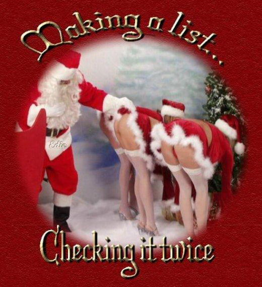 “Hmm Mrs. Claus marked you naughty but you Miss Nancy were ever so sweet last year. You never know if I’m watching or not. I saw you gave your boss some good cheer. With a sweet little smile and a great big gulp, you even gave in and swallowed,” said old Saint Nick to himself. He then marked nice instead of naughty. Next, he moved onto Judy who was a naughty little slut, with quite a firm little butt and marked nice for her as well. He did the same for Cherry who had caught him coming down the chimney last year. Wearing candy cane stockings and red lace panties she danced and stripped and was full of good Christmas cheer. Good old Saint Nick worked away while humming silent night and checking his list.