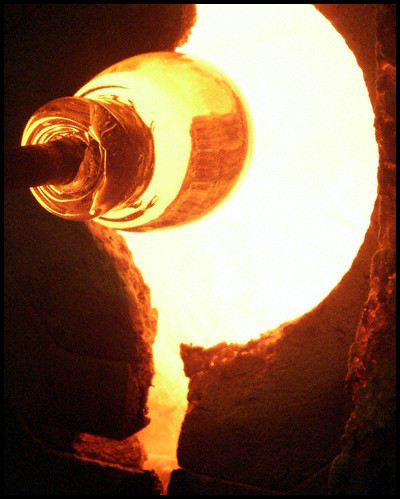 Judging the temperature to be just right, Eve withdrew the glass, twisting carefully the entire time, and placed the rod on an a-frame support. Gloved hands choked up on the spinning pipe, then Eve quickly began the final shaping process. She used a jack and shears to give the piece flutes in the grooves already created by earlier knurling. The overall length and girth of the glass had been determined and achieved earlier, so it was just a matter of smoothing out the edges, then allowing the entire thing to fall, or curve, slightly.