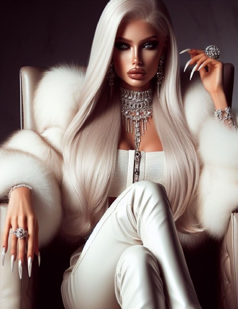 Tiny cannot help but stare at the most overwhelmingly gorgeous creature he’s ever seen before. Obviously extremely tall, even when seated, this blonde goddess is sheathed in supple white leather and sumptuous white fur. Her platinum mane flows to either side of a breathtakingly glamorous face and cascades over a massive pair of breasts. Diamond-laden silver jewelry sparkles everywhere. Long legs are crossed and a shimmering transparent acrylic boot dangles deliciously, its stiletto heel a thin, soaring shaft of sterling.