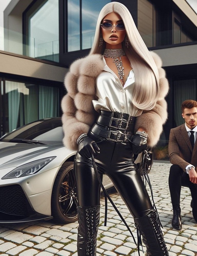 Out of the stretch vehicle alights a handsome, smartly dressed male. He offers a hand up, and a sleek black leather glove slides into it. The arm that follows is wrapped in luxurious fur. However, when the remainder of the female ascends upward out of the interior and plants shimmering black patent thigh boots on the pavement, the crew is hushed in awe. This is the vision of overwhelming, beguiling beauty Daniel had dreamed of.