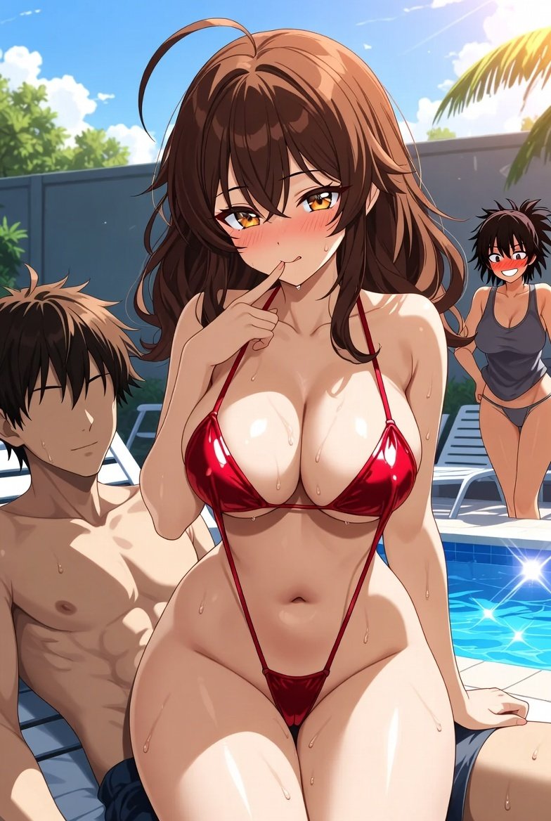 We climbed out of the pool, dripping wet, and made it over to the lounge chairs under the patio. She pushed me down and straddled me, grinding her soaked bikini bottoms right against my cock.
