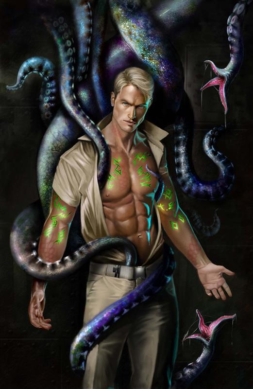 He did not answer, instead his eyes grew a bright green and he grew to at least nine feet tall. I blinked, thinking that my eyes were playing a trick on me. I watched in horror as his shirt was ripped from his muscular torso. A thick, long tentacle popped out, followed by at least nine more. Before I could run, a tentacle wrapped around my ankle. Another wrapped around my wrist and before I could scream out, this creature’s tongue thrust forward and filled my mouth. In a matter of seconds, two more tentacles had secured my free leg and arm.