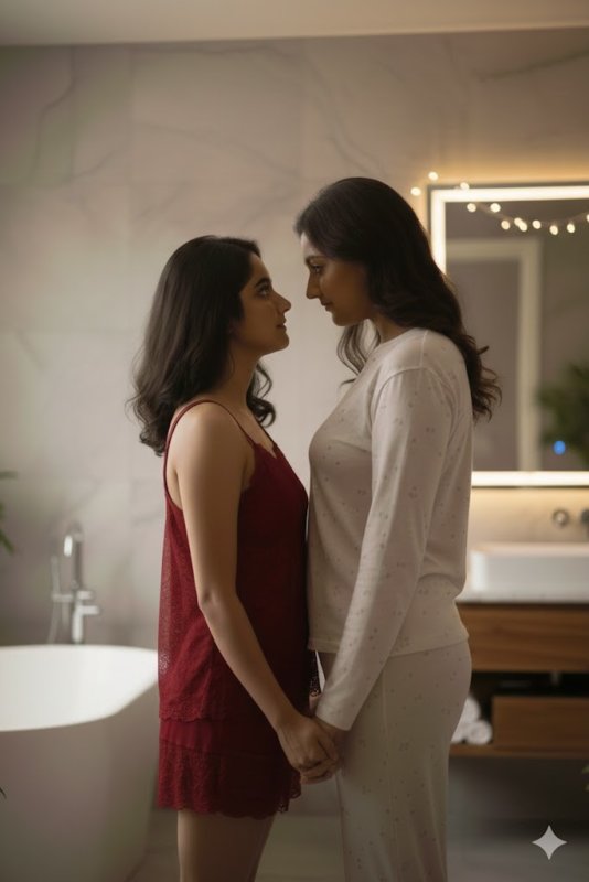 At one point, she dropped the towel and kneaded my curves, hugging me only to earn my response, which was spontaneous. I could not resist. She lifted me like a doll, holding my bum, and kissed me. I wrapped my legs around her and gave her a deep French kiss.