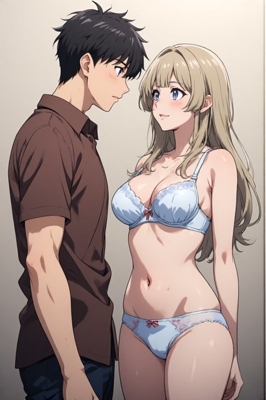 Lisa’s smile is pure mischief as she tugs his boxers down, freeing his erection. She sets them beside her panties. Oliver gives a sheepish grin. “Sorry, but could I try on your panties? They look so comfy, plus… it’s getting drafty in here.”