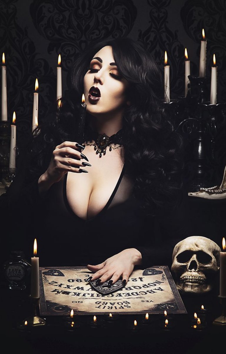 Red tongue flicks out across black lips to sample white jism. Smiling indulgently, the gothic beauty purrs, “Mmmm… Sacrilicious!”