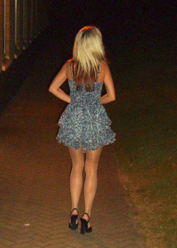 Open-mouthed I followed her gorgeous little naked body, still in her high heels, stockings and suspenders, as she clicked her way along the remainder of the lane, under the two low railway bridges, and sexily walked out in front of me.