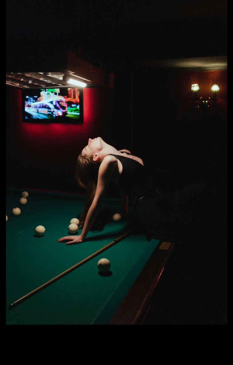 Lena turned and leaned forward over the pool table, her breasts pressing into the felt, her ass high and glistening in the pool of green light.