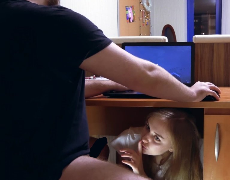 “Hurry under the desk and don’t make a single sound, understood?” I whisper firmly to Cathrine with a raised index finger. She looks displeased, but subsequently slides off my lap as I push the office chair back. Unexpectedly, she gets a big ferocious smile glued to her lips, and crawls into the small space under the desk. She gives me a cheeky, playful look before I walk to the office door. I’m sure she’s got some dirty ulterior motives in her head. I shake my head contentedly and head towards the office door.