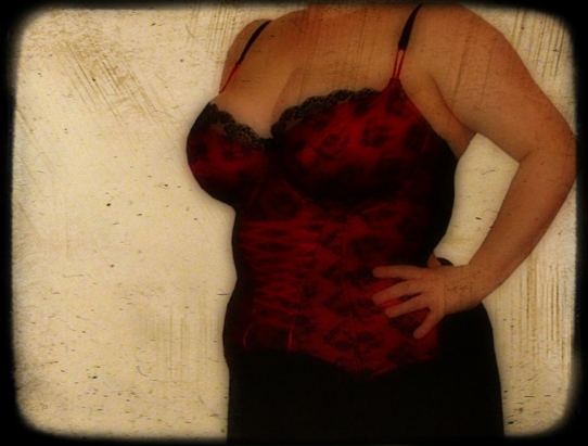 She was now standing across the desk from him. He did not dare to look her in the eyes, but he could look at the rest of her. He could only see her from the top of her hips upwards. Short and wide, she was wearing a red and black lace corset which was cinched in at the waist. For somebody so dumpy, she had a hell of a figure. Her hips were broad and strong, but her waist was strangely small. Her ribs rose up at a steep, widening angle, and were hidden from view by an enormous pair of breasts that looked as if they wanted to spill over at any moment.