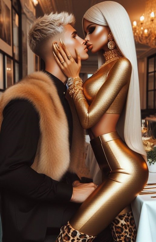 Her fur is tugged away from his shoulders, and he turns his head to gaze upon two sleek, curvaceous ass globes undulating in hypnotic, golden splendor with the ends of waterfall tresses swishing across their shelf-like tops. The clicking of Ms. Raquel’s extremely high heels sends a distressing thought through his lust-crazed haze. ‘She’s leaving,’ it screams, and he finds himself calling out into the void, ”Please,” with no particular purpose.