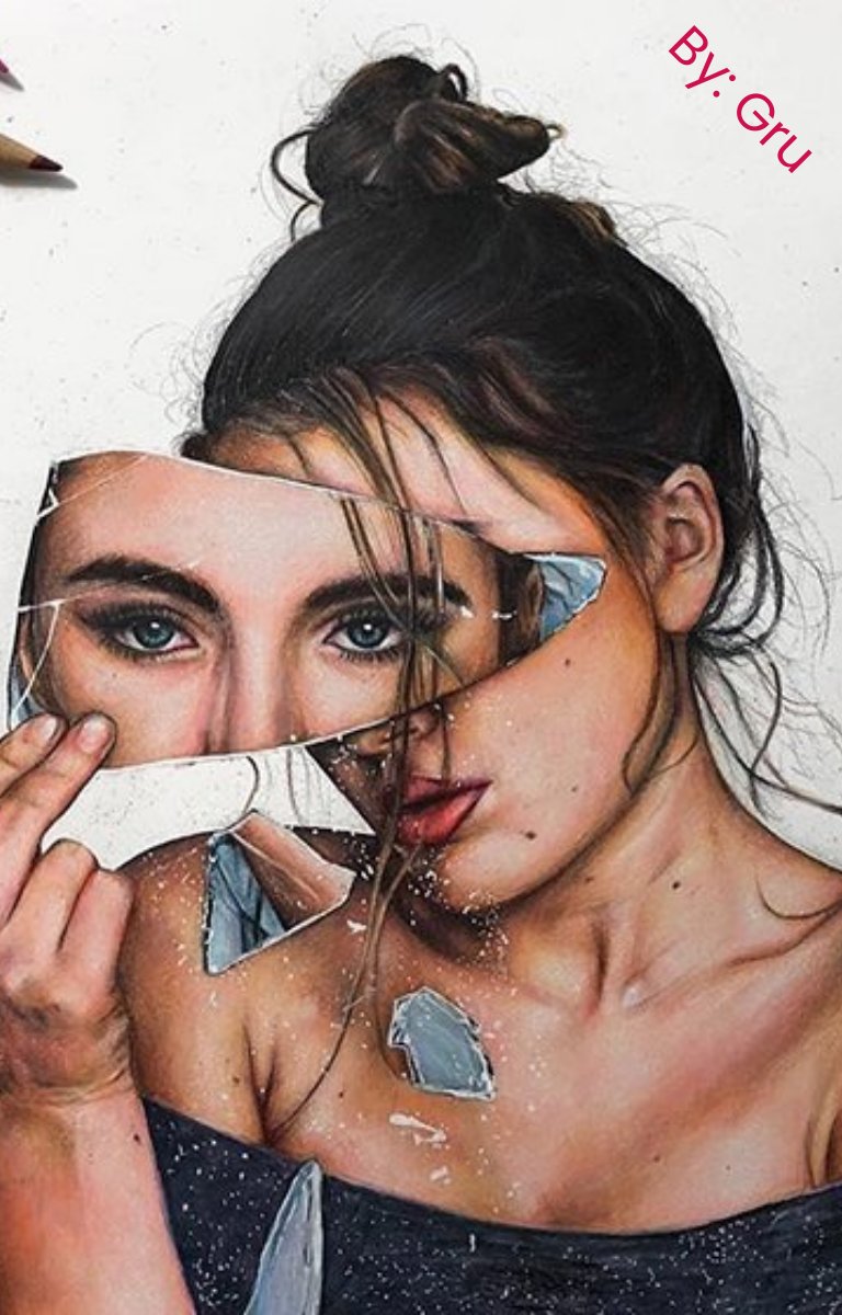 The mirrored portrait laughs and shows her fine teeth, the brush adorns her cheeks.