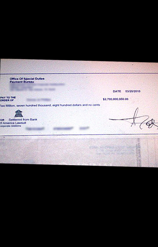 Rikki abruptly hung up on me. Then I looked at the picture of the check again. Two and a half million dollars was written to the left. However, in the area where the numbers are, there were three extra zeroes. The decimal point was in the wrong place as well. That amount would have been two and a half billion dollars.
