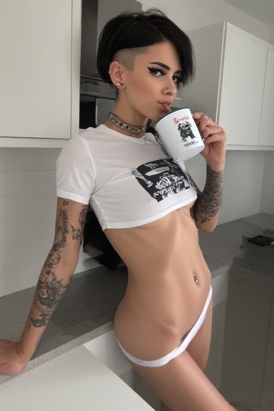 She wore a white shirt so thin it barely qualified as clothing. The fabric clung to her in a way that left nothing to imagination. Her nipple piercings were completely visible through the material, two small barbells that caught the light. The shirt ended just below her ribs, showing off her abs.