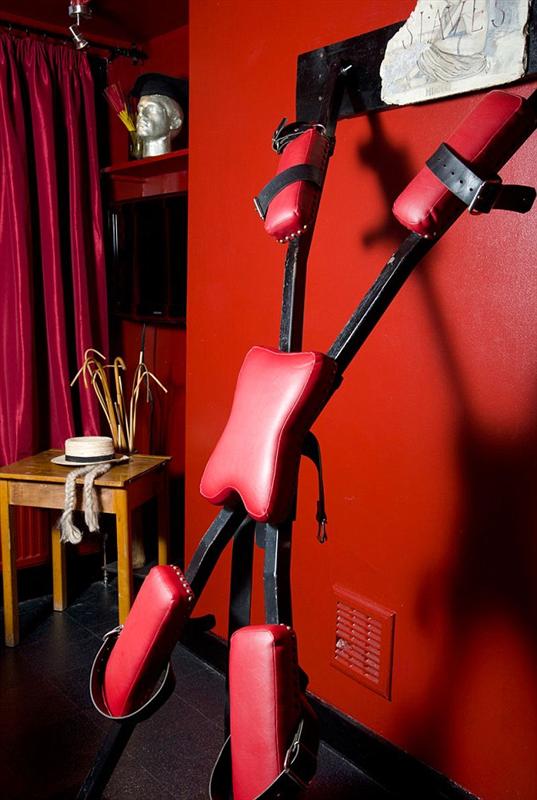 I walked to Lenora, assisted her up and walked her to the wall. I turned her to face out in front of the St. Andrews Cross. I lifted her right hand up and secured it at shoulder height stretched out. I did the left next. I bent down and secured both her feet, spreading her legs wide apart.